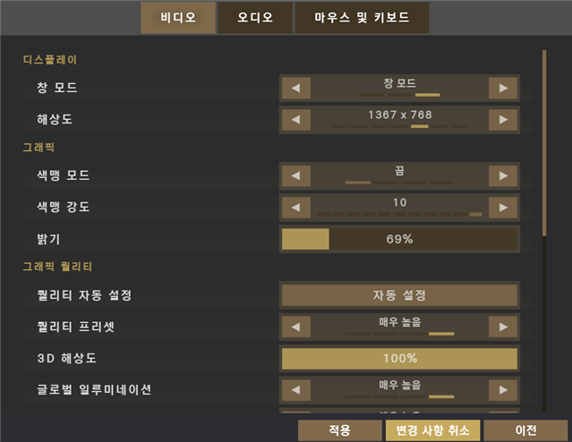 밝기: 어두운 곳에 숨은 적을 더 잘 식별하려면 기본값보다 약간 높게 설정하는 것이 유리합니다.
