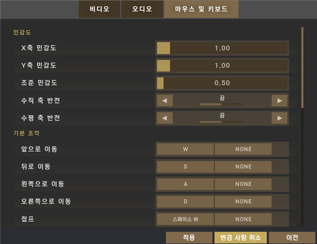 X축 / Y축 민감도: 마우스 이동 속도를 결정합니다. 너무 빠르면 정밀 조준이 어렵고, 너무 느리면 화면 전환이 답답할 수 있으므로 자신만의 값을 찾아야 합니다.