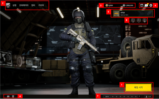 대원님의 현재 계급과 전장에서 불릴 코드네임(계정명)이 상단에 상시 표시됩니다.