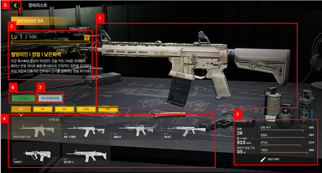무기 선택을 마쳤다면 클릭하여 [무기 정보 화면]으로 돌아가 나머지 세팅(보조무기, 전술무기 등)을 마무리하세요.
