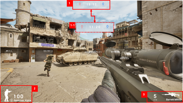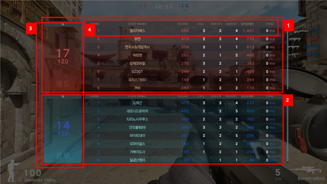 우측 (BLUE): 블루팀의 현재 킬수와 목표 킬수를 표시합니다.